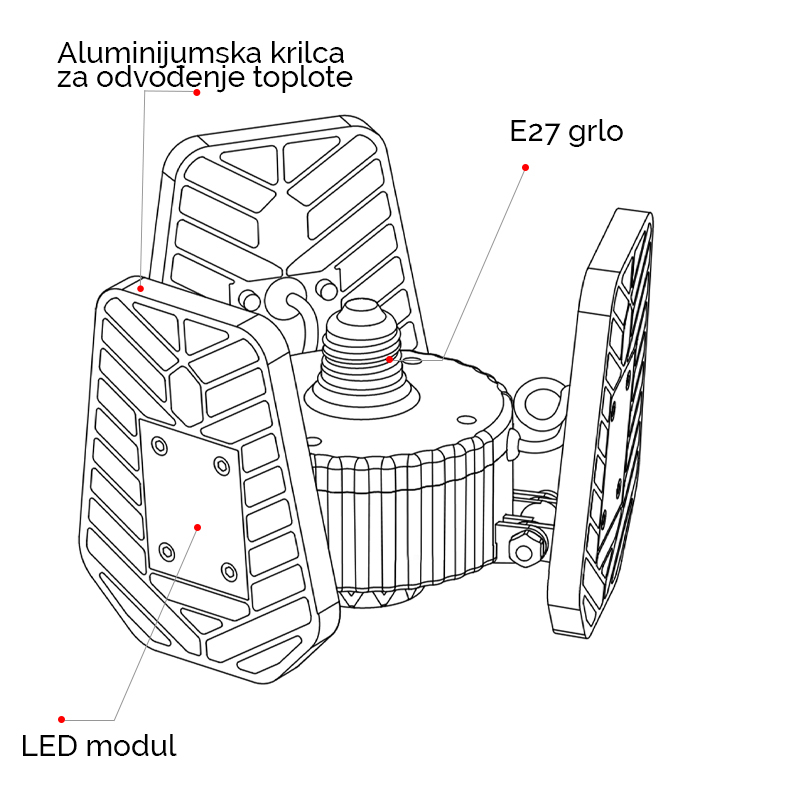 LED reflektor idealan za višenamenske upotrebe zbog svoje velike svetlosne moći i lake mogućnosti podešavanja svake od tri grane. Uz pomoć običnog standardnog grla tip E27 lako se može postaviti na već postojeće sijalično grlo. Ovaj LED reflektor emituje 60w svetla što je ekvivalentno 400w snage klasične sijalice.