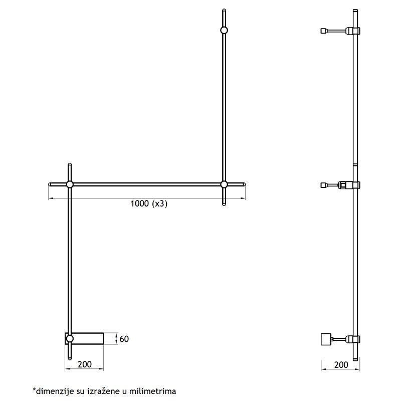 - Dužina 1000 mm (*3), Širina - 60 mm, Visina - 200 mm