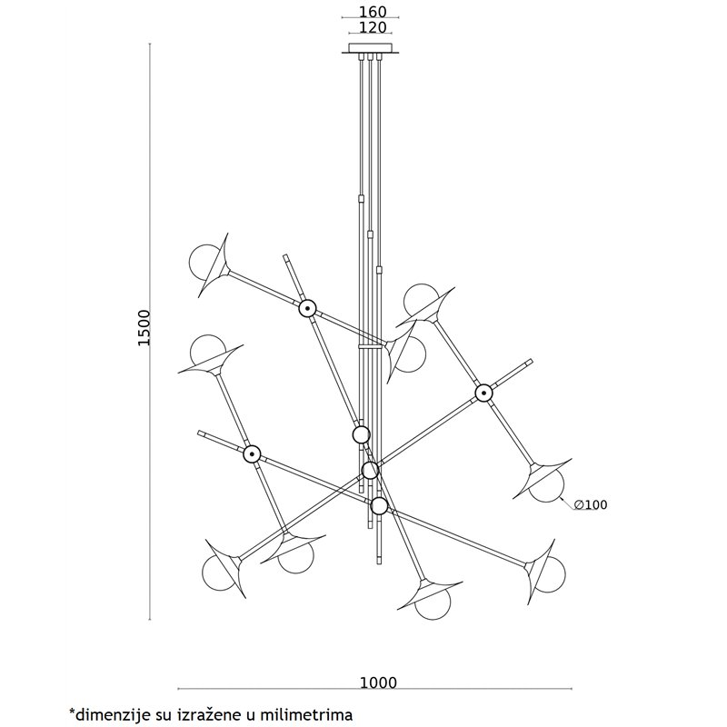 Izuzetno atraktivan luster koji će Vas osvojiti na prvi pogled svojim originalnim izgledom. Njegov kreativni dizajn dodatno ističe svetlost koja isijava iz 9 sijalica tipa G9, koje su maštovito raspoređene u više različitih smerova.