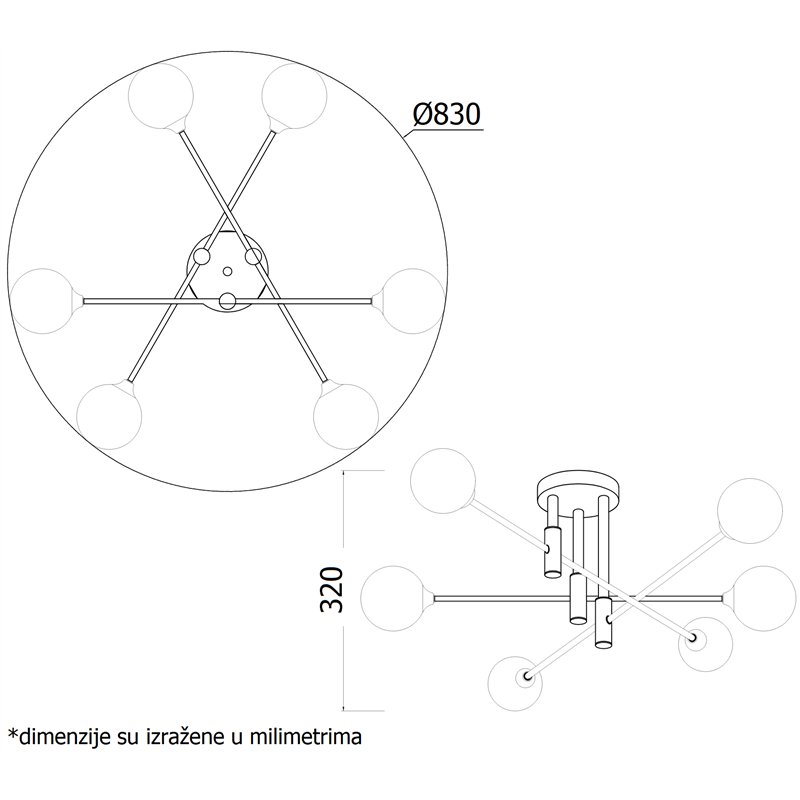Savremen luster niske visine od plafona u kombinaciji crne i zlatne boje. Ima 6 sijaličnih grla tip G9 što, uz odgovarajući izbor LED sijalica može dati solidnu svetlosnu moć.