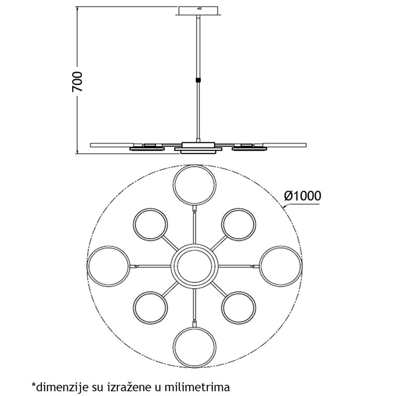 LED luster modernog izgleda, izrađen od metala u mesing *(zlatnoj )boji sa toplo belom bojom svetla. Ovaj model ima 8 prstenova koji emituju svetlost snage 76W, što je sasvim dovoljno za prostorije veće kvadrature. Odličan je i za veće dnevne sobe, trpezarije, velika predsoblja. Podesiv je po visini. Svaka grana ovog lustera je okrenuta u drugom smeru i na svom kraju poseduje zglob, pomoću koga se svetlosni LED prstenovi mogu dodatno okrenuti u različitim smerovima, po želji.