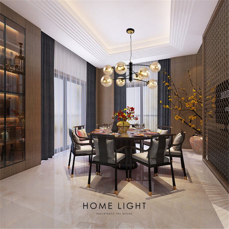 Luster u crnoj i bakarnoj kombinaciji, sa 8 kugli u amber boji, odličan je izbor za prostrane prostorije, kao što su dnevne sobe i trpezarije, donoseći elegantnu i efektivnu rasvetu.