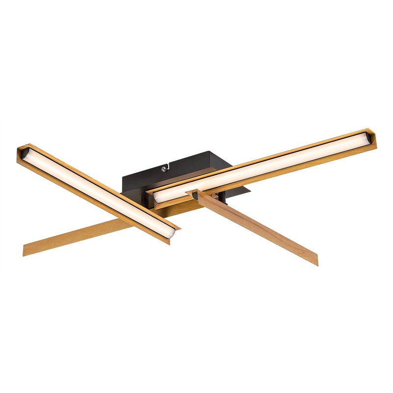 Plafonska lampa Remiel se prvenstveno preporučuje onima koji bi svoju modernu dnevnu sobu rado ulepšali spektakularnim modelom posebnog dizajna. Što se tiče boja, metalni Remiel kombinuje mat crnu sa elementima sa efektom drveta. Suština dizajna ove plafonske svetiljke su elementi u obliku šipke koji vire u različitim pravcima i upotpunjeni belim plastičnim abažurima. Remiel se može pričvrstiti na plafon uz pomoć crne dekorativne osnove duguljastog oblika. Lampa ima ugrađen LED izvor svetlosti energetske klase G snage 20W, svetlosnog toka od 1.200 lumena sa senkom i 1.800 lumena bez senke, i životnog veka od 30.000 sati. Temperatura boje ovog plafonskog svetla je 3.000 K, shodno tome, zrači toplo belo svetlo i pomaže vam da stvorite ugodnu, intimnu atmosferu. Dimenzije Remiela su sledeće: širina 750 mm, visina 620 mm, rastojanje od plafona 95 mm.