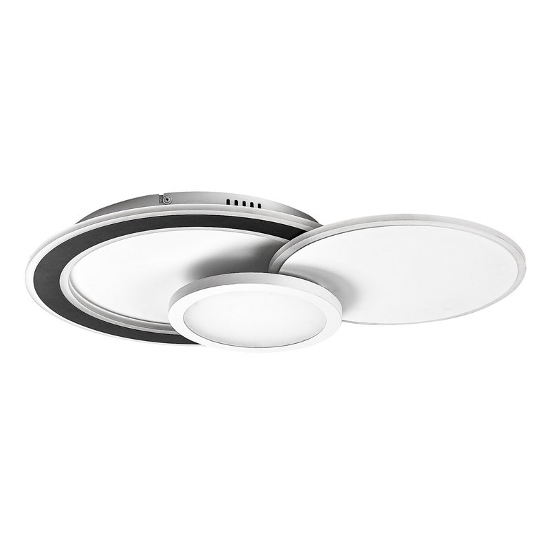 Rabalux Stavros plafonska lampa se preporučuje onima koji smatraju da su kreativan dizajn i pametne funkcije podjednako važni. Ova LED lampa je izrađena od metala u crnoj boji sa belim plastičnim senzorom i sastoji se od tri okrugla, delimično preklapajuća elementa različitih veličina. Lampa ima ugrađeni LED izvor svetlosti koji garantuje energetski efikasan rad i dug vek trajanja. Temperatura boje lampe može se podešavati pomoću daljinskog upravljača ili zidnog prekidača. Pored toga, dostupno je RGB osvetljenje koje se primenjuje na površini najmanjeg, centralnog elementa lampe. Osvetljenost plafonske lampe je takođe prilagodljiva, a dostupna je i funkcija memorije - obe funkcije se mogu kontrolisati daljinskim upravljačem. Svetlosni intenzitet lampe je dovoljan za osvetljavanje većih prostorija. Idealna je za dnevnu sobu, trpezariju ili spavaću sobu.