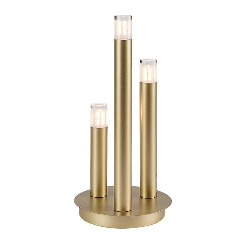 Rabalux Ramira stona lampa je idealan izbor za one koji preferiraju jedinstveni dizajn i univerzalne, lako prenosive modele. Lampa je izrađena od metala u elegantnoj zlatnoj boji, sa providnim akrilnim abažurima na vrhu glava lampi. Dekorativna baza je okruglog oblika, sa tri cilindrična elementa lampe različitih visina, koji podsećaju na sveće. Dizajnerska stona lampa može se postaviti u različite prostorije vašeg modernog doma: može biti stilski dodatak dnevnoj sobi, kuhinji, trpezariji ili spavaćoj sobi. Upravlja se kablovskim prekidačem i može se koristiti sa tri izvora svetlosti, svaki sa snagom do 5 W. Tip grla je G9. Možete odabrati sijalice koje emituju toplo ili prirodno belo svetlo. Isporučuje se bez izvora svetlosti.