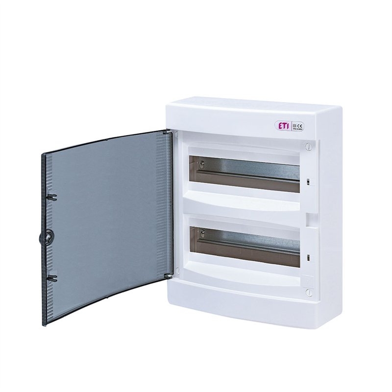 ETI razvodna tabla ECT24PT je površinski montirana distribuciona kutija, idealna za efikasno upravljanje električnim instalacijama. Sa naponom od 400 V i maksimalnim strujnim opterećenjem od 63 A, ova tabla je pogodna za razne primene u stambenim i komercijalnim prostorima. Opremljena je sa 24 modula (12 po redu) i 13 PE/N terminala, obezbeđujući pouzdanu zaštitu uz IP40 ocenu otpornosti na prašinu i vlagu. Prozirna plastična vrata omogućavaju laku vizuelnu inspekciju, dok je beli plastični okvir dugotrajan i estetski privlačan.