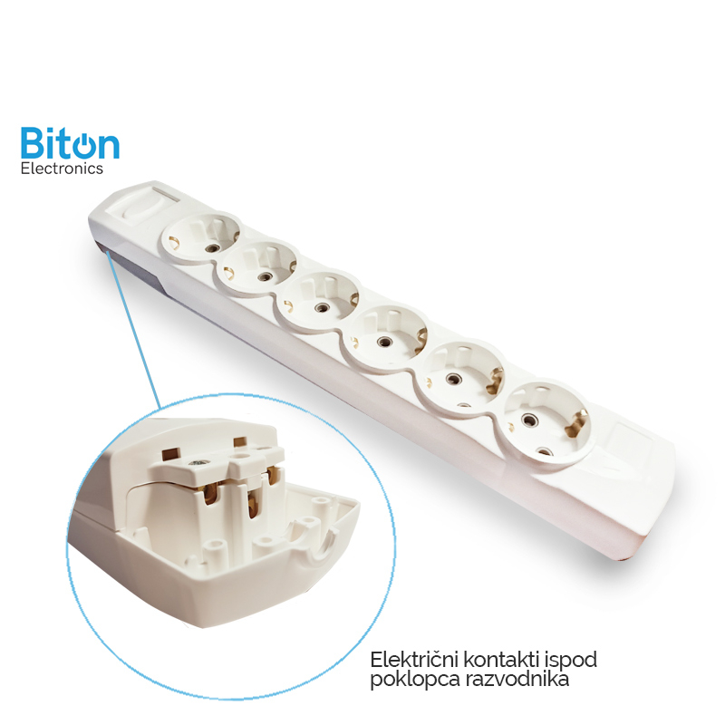 Gnezdo sa šest mesta za situacije kada Vam treba više mesta za uključivanje raznih elektro uređaja. Prodaje se bez kabla i nema prekidač na sebi. Podržava grejna tela snage do 2 Kw, a ukupnu snagu koju može da podnese je oko 2.5Kw.