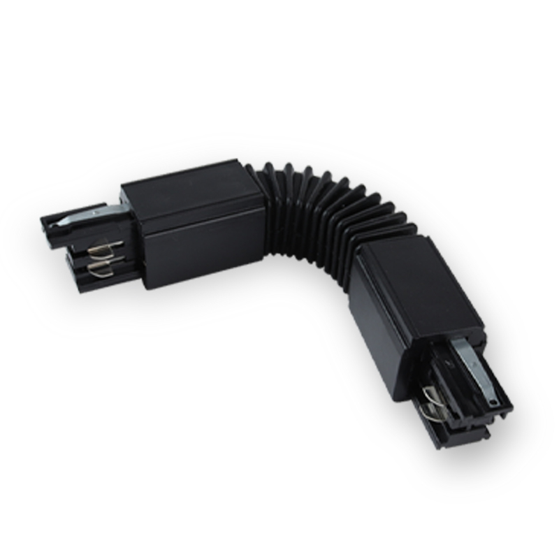 Fleksibilni i savitljivi konektor za trofaznu šinu crne boje. Dobra savitljivost ovog konektora daje veću slobodu i kreativnost prilikom postavljanja i planiranja šinske rasvete.