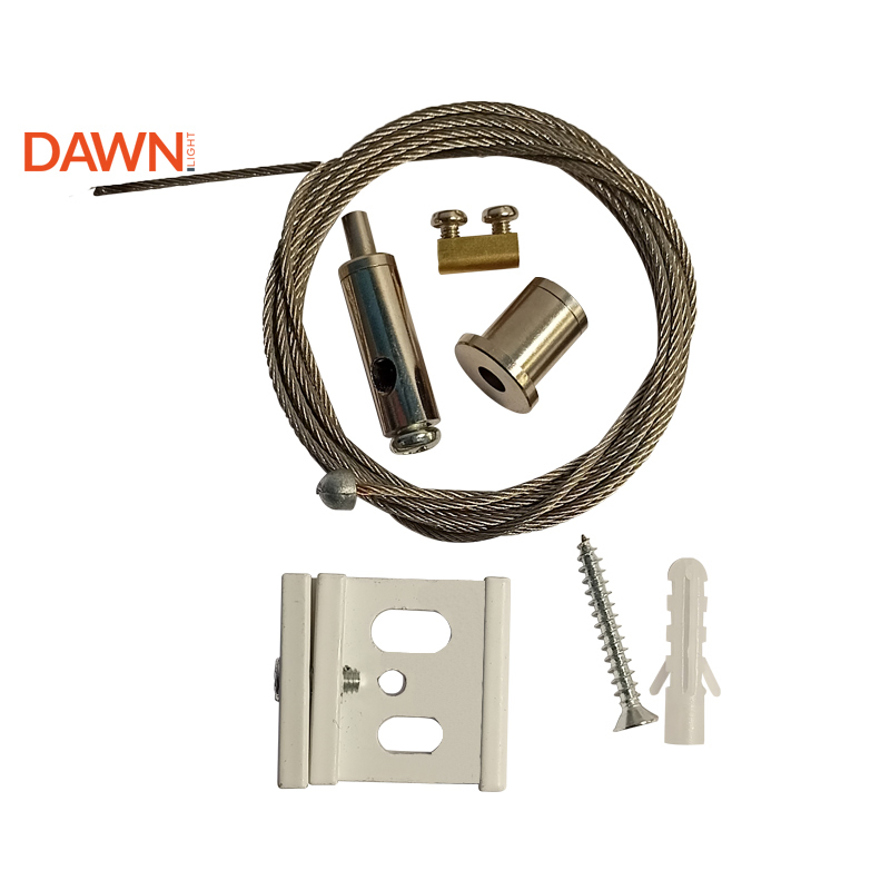 Komplet set sajle za kačenje trostepenih WSO šina bele boje. Ovaj komplet podrazumeva - sajlu dužine 2 metra i sve što je potrebno za njeno vezivanje za šinu i plafon.