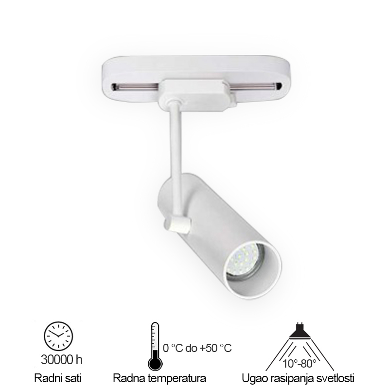 Šinski reflektor bele boje i elegantnog dizajna sa sijaličnim grlom tip GU10. Sijalica se lako može menjati i prilagođavati vašim potrebama.