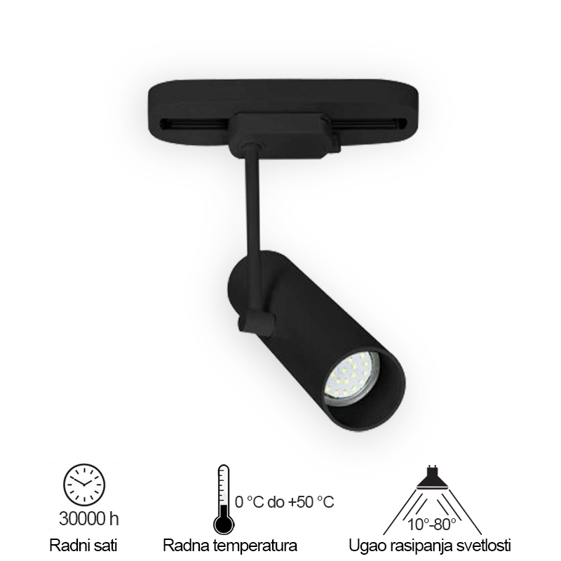 Šinski reflektor crne boje i elegantnog dizajna sa sijaličnim grlom tip GU10.
