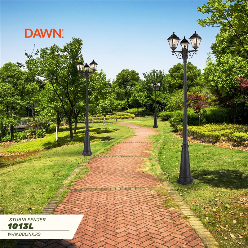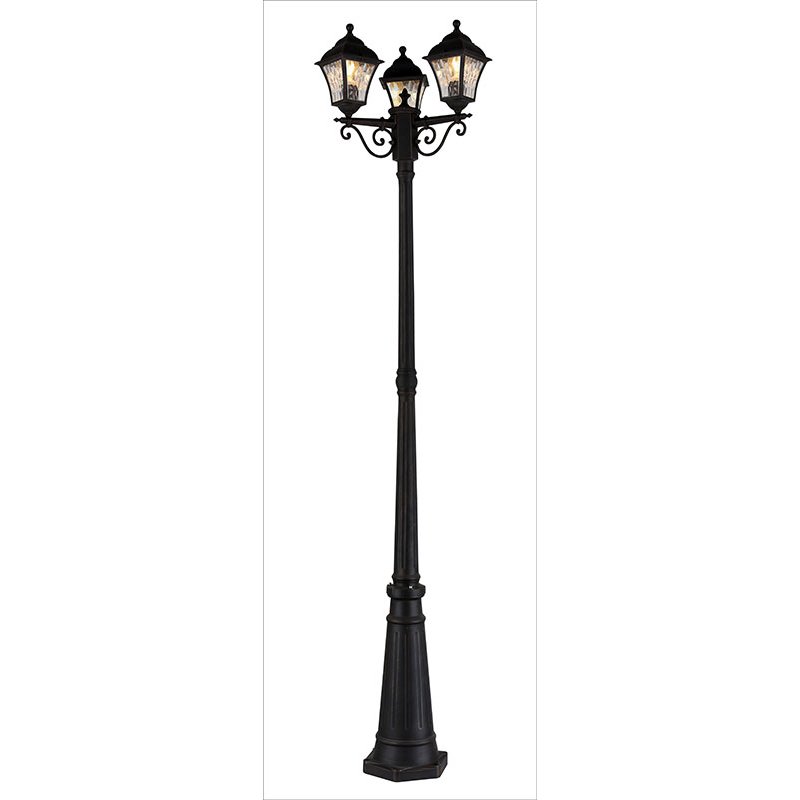 Stubna svetiljka/fenjer rustičnog izgleda, u crnoj boji. Visina 2,2 metra i sa tri sijalična mesta tip E27. Proizvod se prodaje bez izvora svetla.