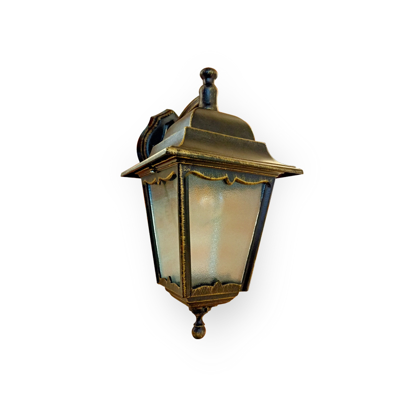 Zidni fenjer u boji starog zlata izrađen od legure aluminijuma sa staklenim difuzorom.