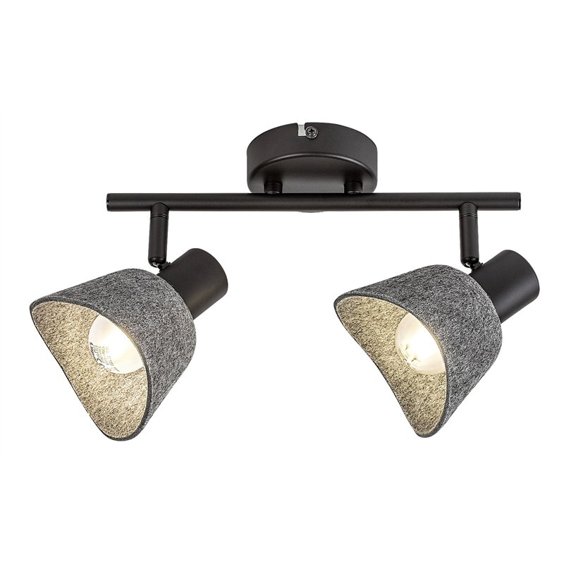 Rabalux Farelia 2-sijalice plafonska spot lampa se preporučuje onima koji vole lampe sa jedinstvenim izgledom koje doprinose prijatnoj atmosferi. Ovaj model je izrađen od metala u crnoj boji sa sivim filcanim senkama. Materijal od kojeg je senka napravljena je ekološki prihvatljiv, reciklirani materijal. Lampa se može pričvrstiti za plafon pomoću male okrugle dekorativne baze, na koju je pričvršćen cilindrični štap koji drži glave lampe. Zakrivljeni oblik senki u obliku zvona, u kombinaciji sa mekim filcanim materijalom, daje lampi prijatan, srdačan izgled. Idealna je za dnevnu sobu, spavaću sobu ili radnu sobu. Može se koristiti sa dva izvora svetlosti, svaki snage do 10 W. Tip grla je E14. Ova 2-sijalica spot lampa je izrađena sa praktičnim fleksibilnim glavama lampe. Lampa se isporučuje bez izvora svetlosti.