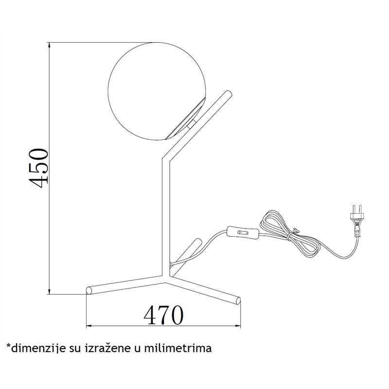 Stona lampa minimalističkog dizajna sa staklenom kuglom na vrhu. Lampa ima međugajtanski prekidač, kabl dužine 2 metra i jedno sijalično grlo tio E27.