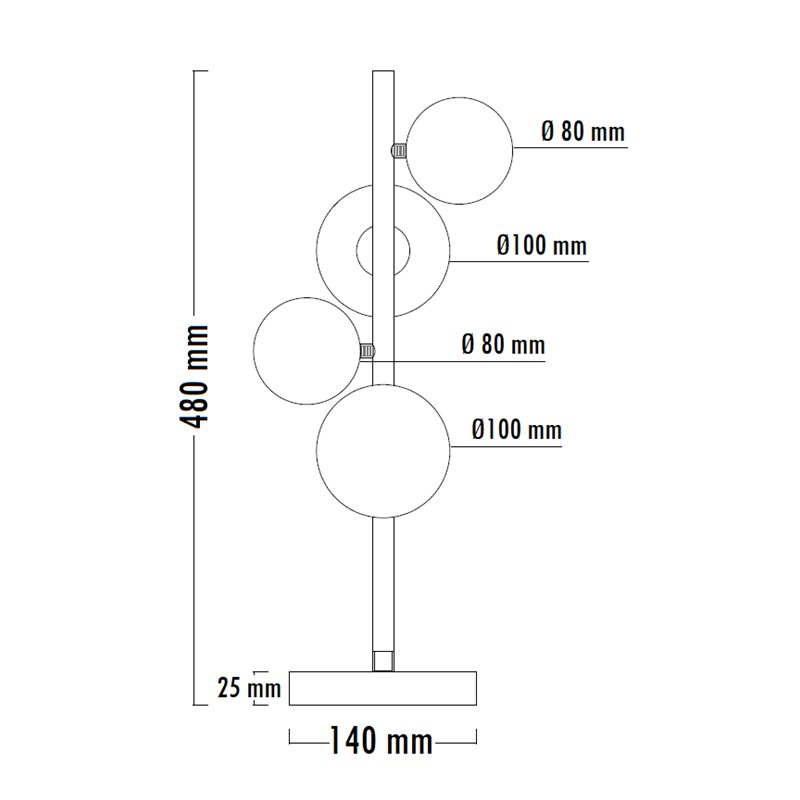 Stona lampa sa telom crne boje i 4 abažura, transparentne staklene kugle različitih dimenzija, u boji konjaka. Koristi G9 sijalice. Izborom boje sijalice, kao i korišćenjem dimabilnih sijalica, uz odgovarajući potenciometar možete pojačavati i smanjivati jačinu svetla i kreirati ambijent po želji. Dužina kabla je 1.5 metar.