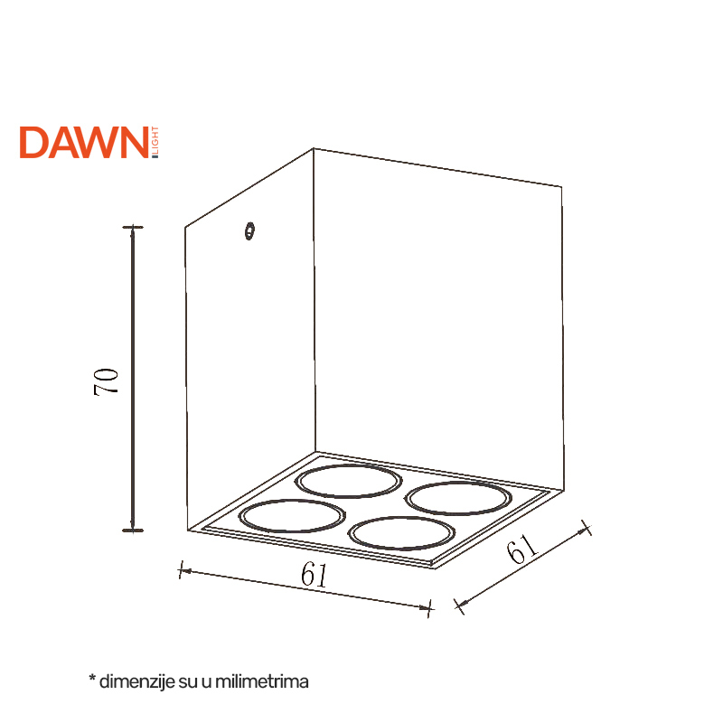 Nadgradna LED svetiljka sa četiri spot svetiljke raspoređene u kućištu čije je dno modernog i minimalističkog dizajna u obliku kvadrata.