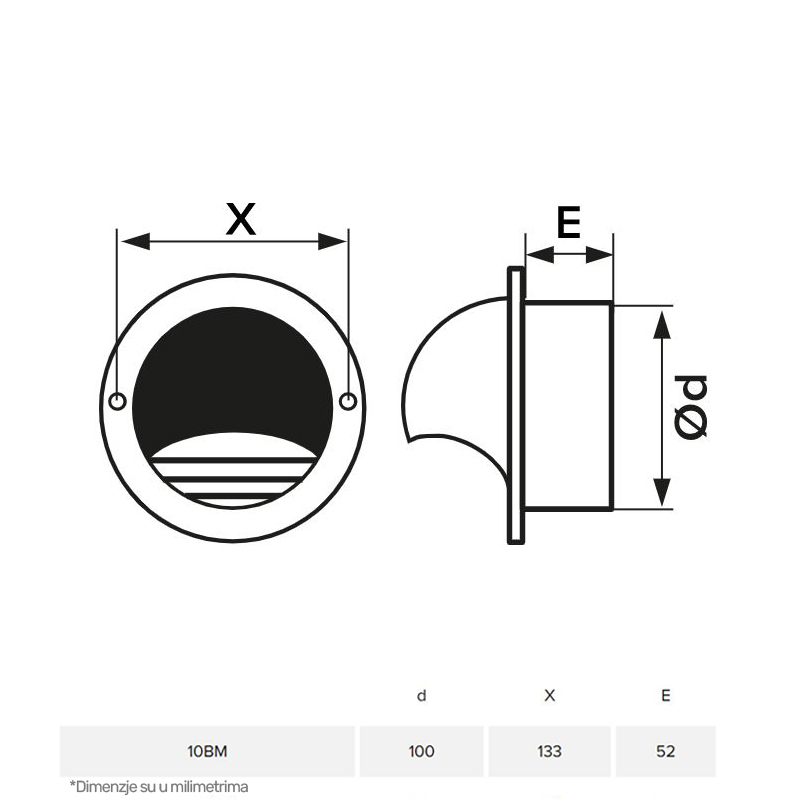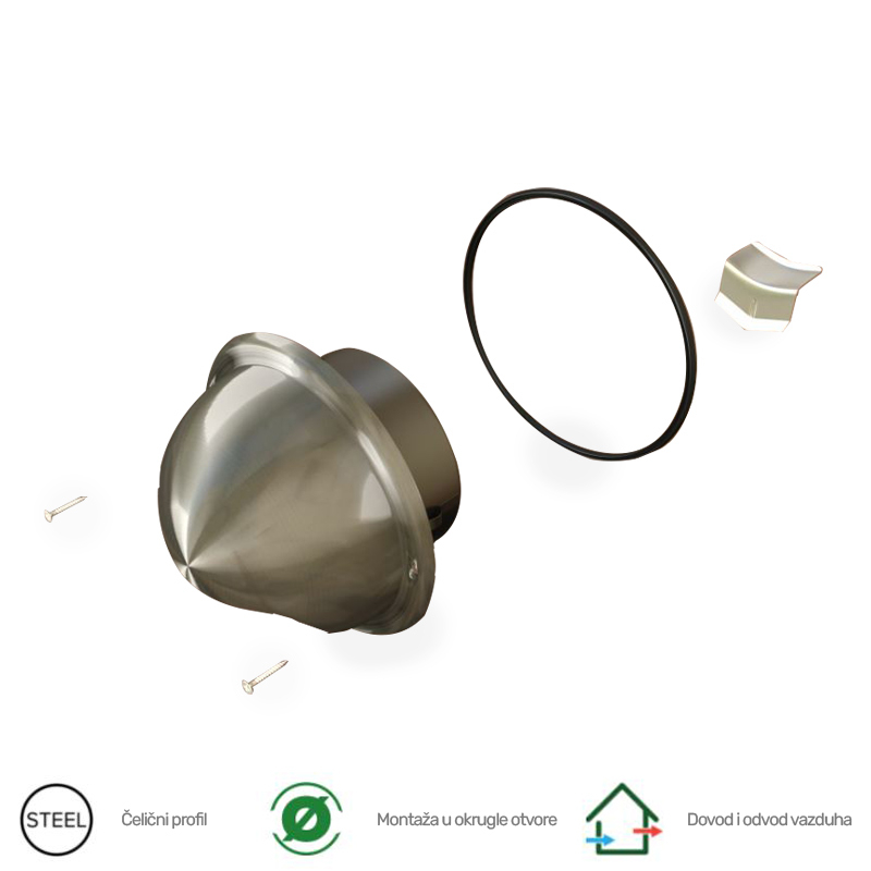 Metalna žaluzina za odvod vazduha u zidu sa prirubnicom prečnika 100mm. Montira se u okrugle otvore.