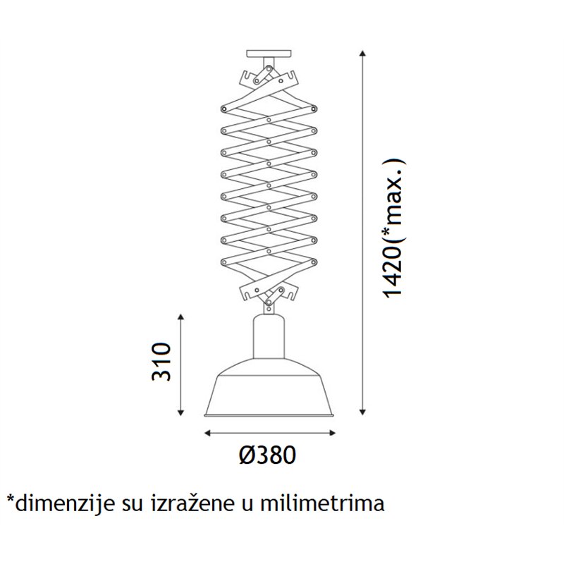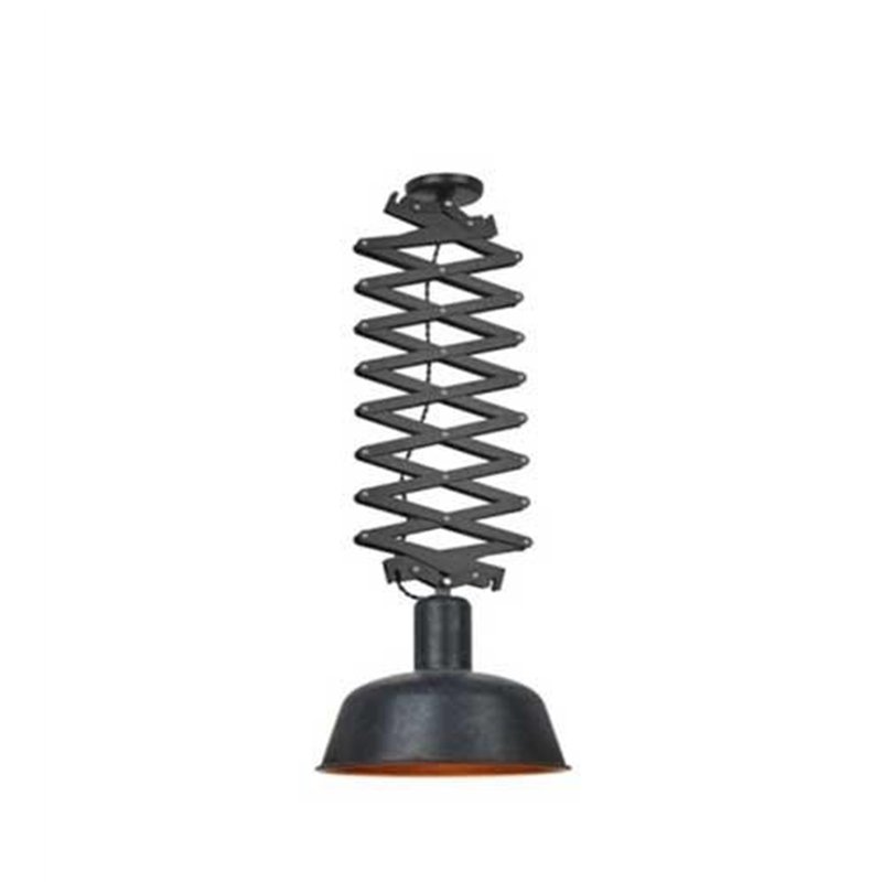 Nadgradna viseća svetiljka industrijskog retro dizajna, koja je zahvaljujući mehanizmu "makaza" podesiva po visini. Abažur mat crne boje spolja, zlatne boje iznutra.