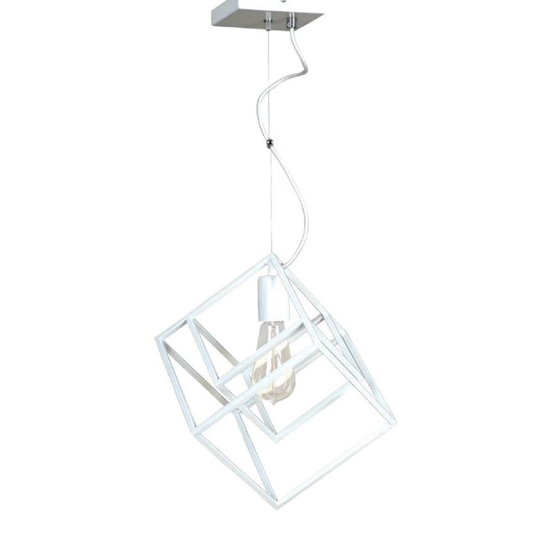 Interesantna visilica bele boje u obliku geometrijskog tela sa kockom u kocki. Jedno sijalično grlo tipa E27. Mogućnost podešavanja visine. Savršena za postavljanje iznad šankova, pultova i trpezarijskih stolova. Proizvod se prodaje bez izvora svetla.