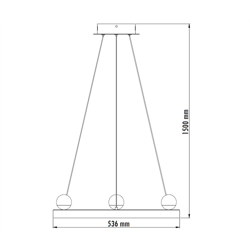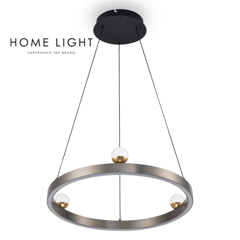 Led luster, sivo zlatne boje i toplo bele boje svetla. Osvetljenje snage 40W daje iz tri kugle, abažura koji su postavljeni na gornjem delu kružne linije rasvete, kao i na dole celom dužinom obima konstrukcije. Ovo je model rasvete koji svojim izgledom privlači pažnju i postaje centralni fokus modernih enterijera.