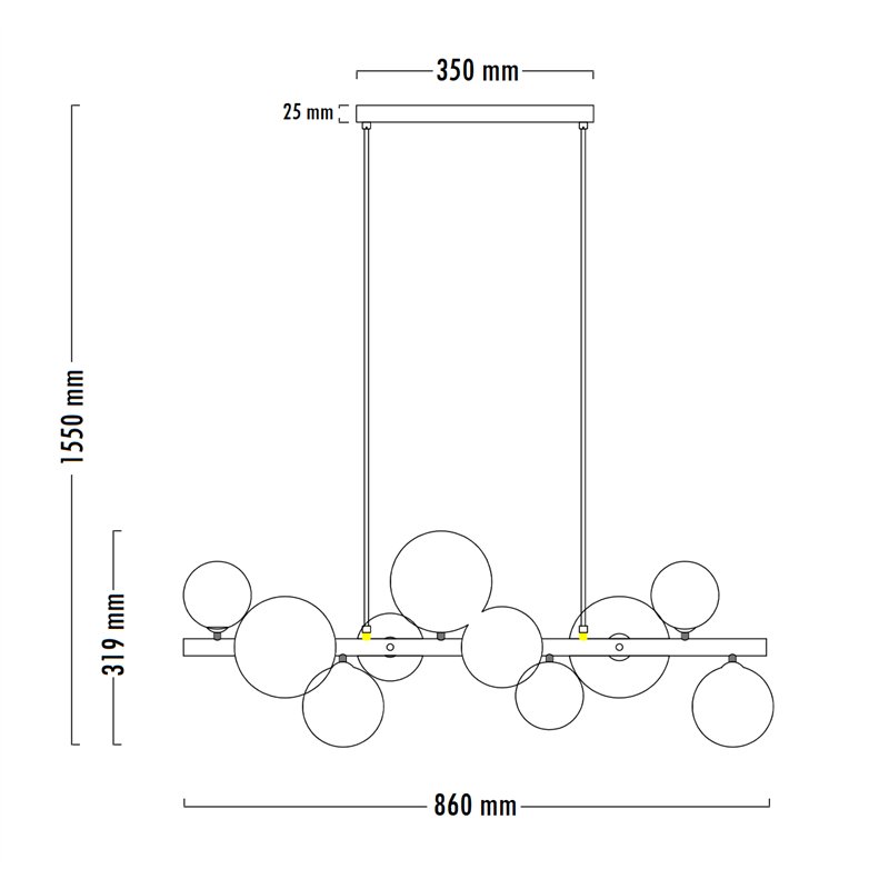 Moderna i atraktivna visilica koja će napraviti sjajan ambijent i ostaviti odličan utisak na posetioce bilo da je reč o vašem domu ili ugostiteljskom ili hotelskom enterijeru. 10 kugli u boji konjaka, raspoređene su na konstrukciji boje mesinga u različitim smerovima, kako bi se naglasio njen originalan dizajn, kao i dekorativni karakter. Koristi sijalice tip G9, koje možete kupiti zasebno.