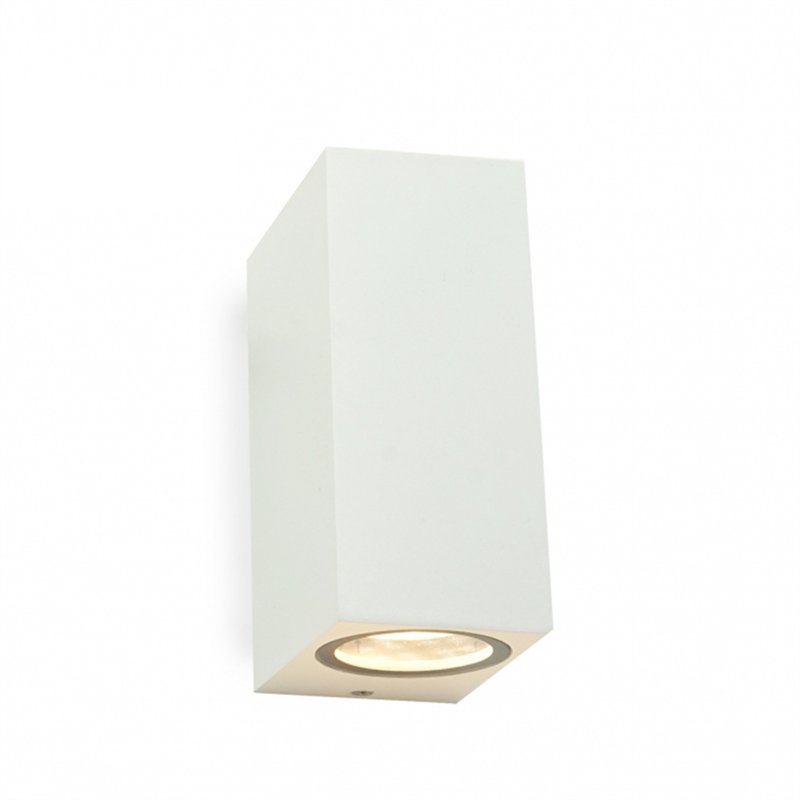 Spoljna zidna svetiljka, bele boje, IP65 zaštita. Poseduje 2 sijalična grla, tip GU10. Elegantnog dizajna, izrađena je u obliku kvadra, od aluminijuma sa odličnom završnom obradom. Idealna je za postavljanje na fasade stambenih i industrijskih objekata, na terasama i u dvorištima.
