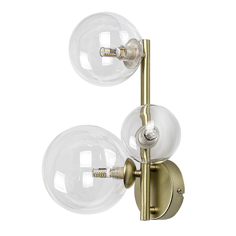 Zidna lampa Rabaluk Aslov je savršen izbor za dnevnu ili spavaću sobu ako tražite modernu i kreativno dizajniranu komplementarnu lampu koja takođe obezbeđuje željeni intenzitet svetlosti. Metalni uređaj briljantne zlatne boje upotpunjen je providnim sfernim staklenim nijansama, koje podsećaju na male i velike mehuriće. Pošto su izvori svetlosti jasno vidljivi kroz njih, dobra je ideja koristiti nekonvencionalne, estetske sijalice. Različite veličine i pozicioniranja glava sijalica doprinose jedinstvenom izgledu već posebnog modela. Zidna lampa ima grla G9, u koje mogu da se smeste tri sijalice, svaka snage do 28 V. Proizvod se isporučuje bez izvora svetlosti.
