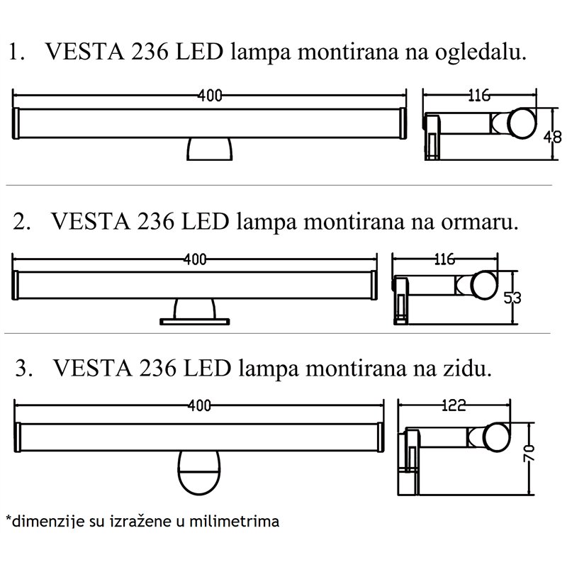 Zidna LED kupatilska lampa pogodna kao pomoćno svetlo iznad ogledala i na zidu u kupatilima, u kuhinjama.